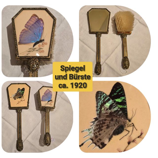 Das Set besteht aus Handspiegel und Bürste mit einem messingfarbenem Griff. Dieser ist stark verziert. Rückseite beider Teile ist mit einem echtem Schmetterling und Blütenzweig auf beigem Samt unter Glas.